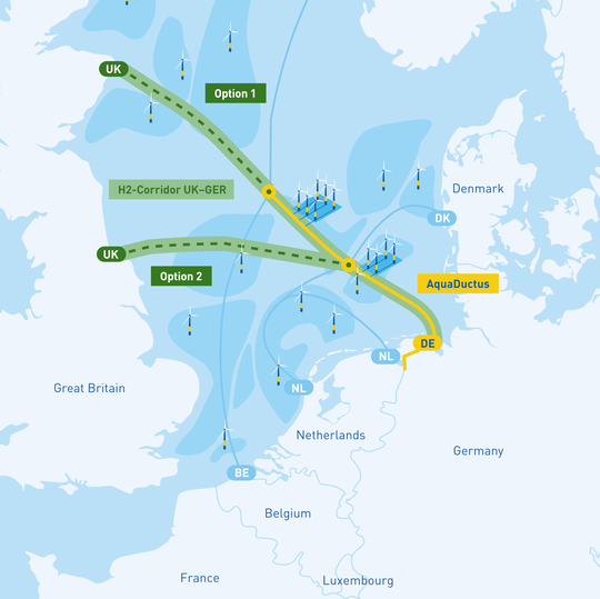 Durch die Integration von AquaDuctus in den Wasserstoffkorridor zwischen Großbritannien und Deutschland wird es auch möglich sein, offshore aus erneuerbaren Energien in der Nordsee produzierten Wasserstoff zu beziehen.