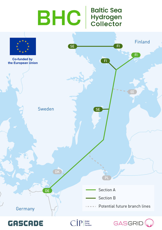Der Baltic Sea Hydrogen Collector (BHC) ist ein grenzüberschreitendes Projekt, das die Versorgung mit grünem Wasserstoff in den nordischen Ländern und Mitteleuropa sicherstellen wird. Das BHC-Konsortium besteht aus Gasgrid Finland, GASCADE Gastransport und Copenhagen Energy Islands – einem Teil von Copenhagen Infrastructure Partners.